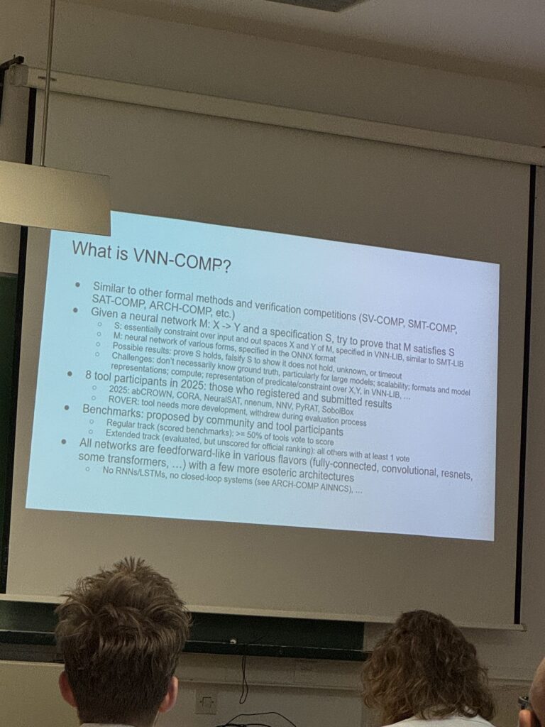 Konstantin Kaulen (https://rwthcontacts.rwth-aachen.de/person/PER-SF4C2YW ) presented the results of this year’s Verification of Neural Networks Competition (VNN-COMP) which was certainly a highlight at the symposium and saw the largest attendance.